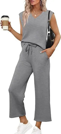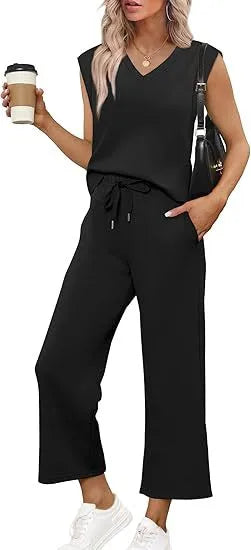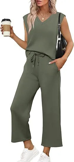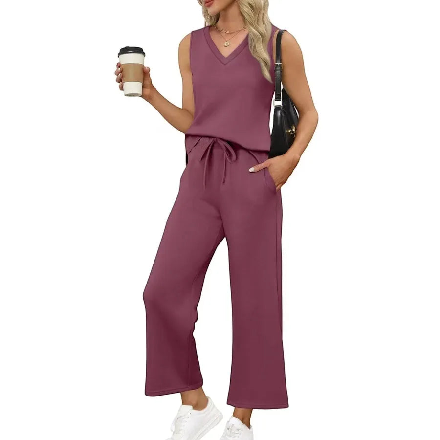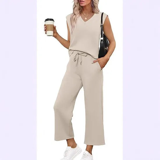 Casual Sleeveless V-Neck Vest Top And Seven-Piece Pants Women's Fashion Set Polyester Fabric Leisure Style Pure Color Pattern