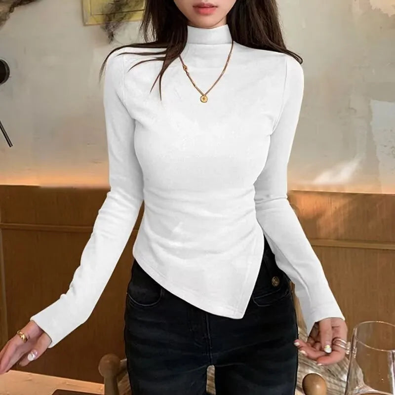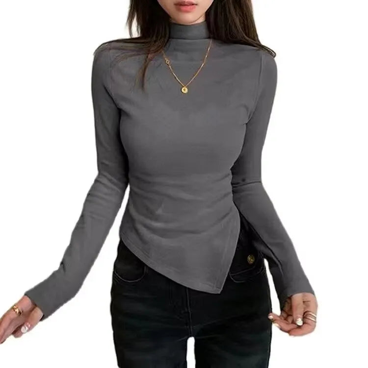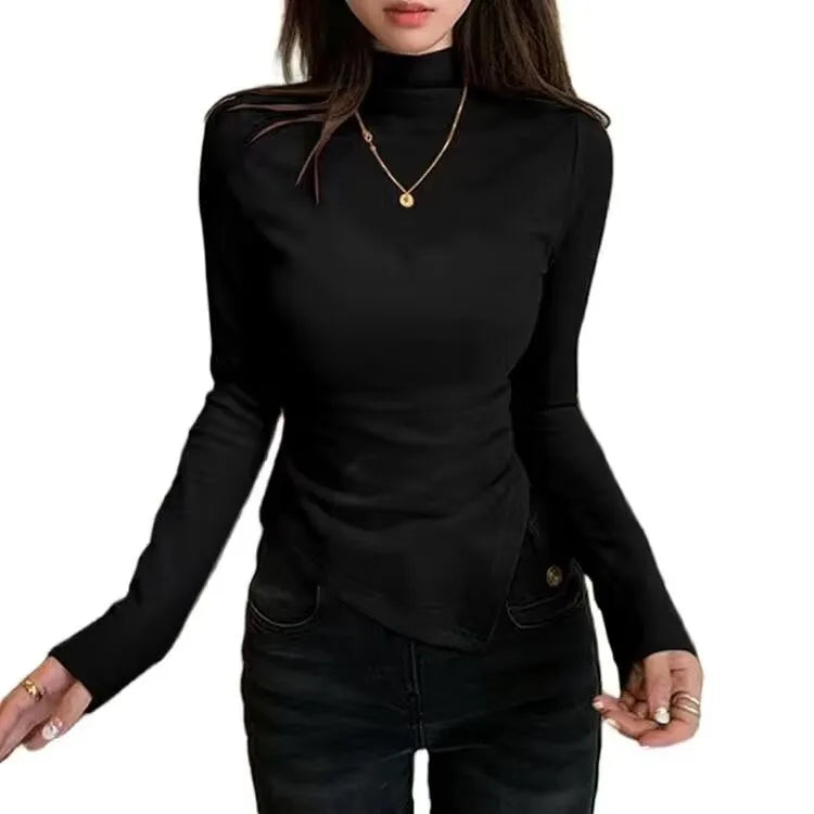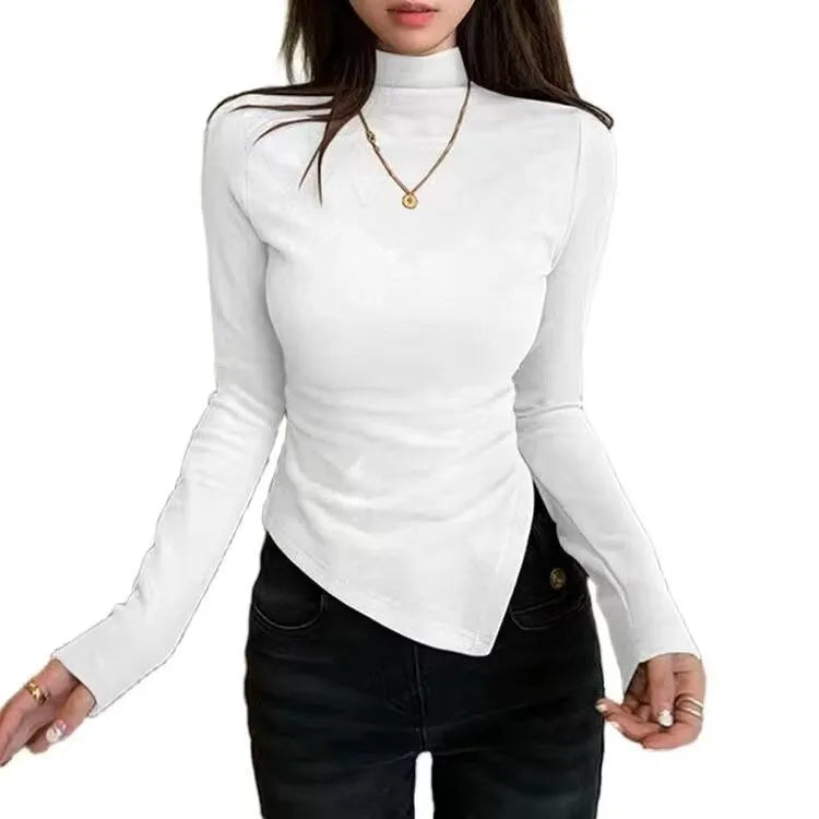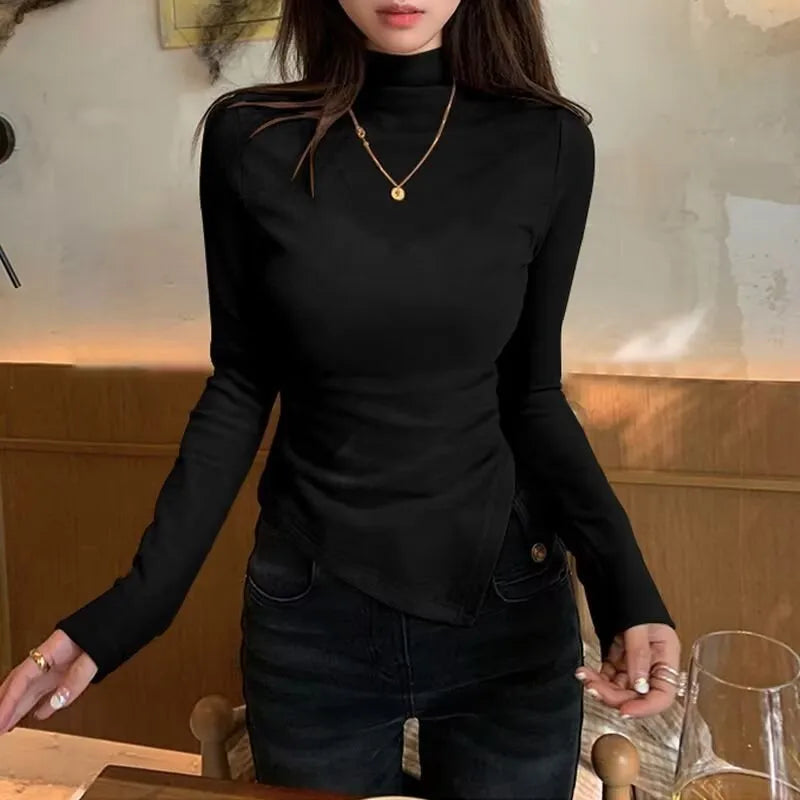 Dervo Half High Collar Base Layer Shirt Women's Autumn Winter Irregular Shoulder Long Sleeve Slim Fit T-Shirt Top