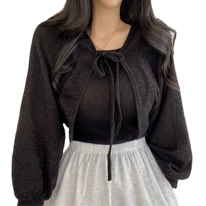 New Chic Summer Vintage Versatile Design Tie-Detail Lantern Sleeve Short Thin Open Cardigan Women's Fashion Polyester Blend
