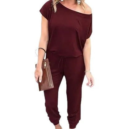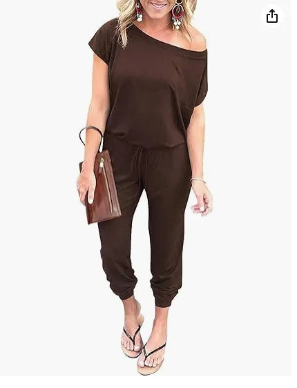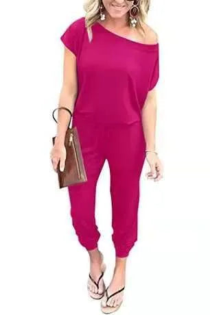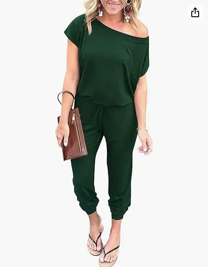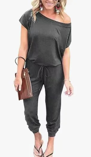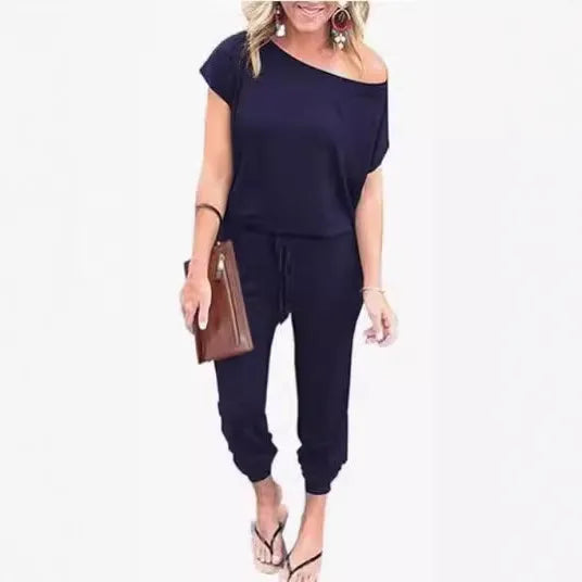 Spring Summer Fashion Asymmetrical Shoulder Short Sleeve Pocket Women's Overall Pants Cotton Elastic